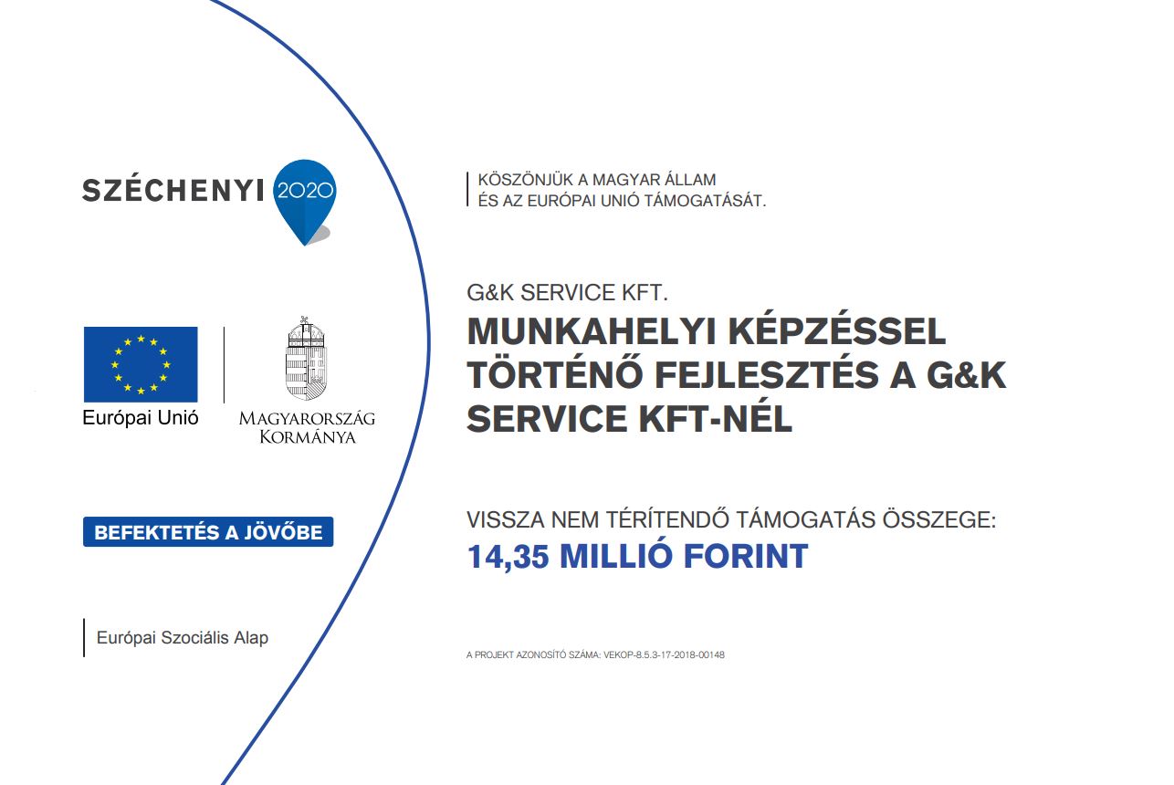 A VEKOP-8.5.3-17-2018-00148 azonosítószámú projekt megvalósítására a G&K Service Kft. szigetszentmiklósi telephelyén került sor a Széchenyi 2020 program keretében, az Európai Unió támogatásával. A projekt célja munkahelyi képzések megvalósítása.